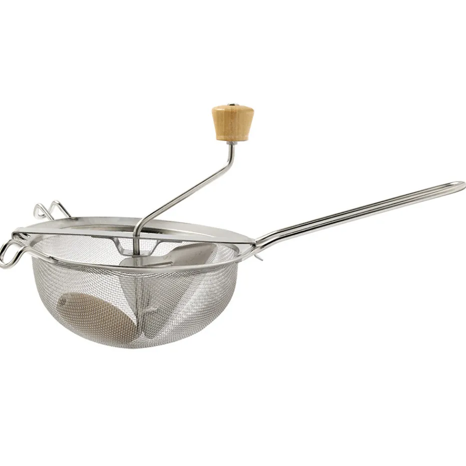 Une fois votre préparation chauffée, à la consistance souhaitée, il vous suffit de la verser dans votre tamis positionné au-dessus d’un récipient. Tournez ensuite la manivelle. Le tamis va alors filtrer votre préparation sans laisser passer le moindre morceau ou pépin.