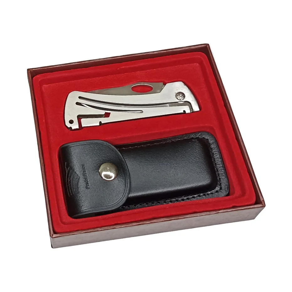 Accompagné de son étui en cuir véritable avec passant de ceinture, vous pourrez le transporter facilement et le garder à portée de main. Sa lame en acier inoxydable vous assurera une découpe de qualité.