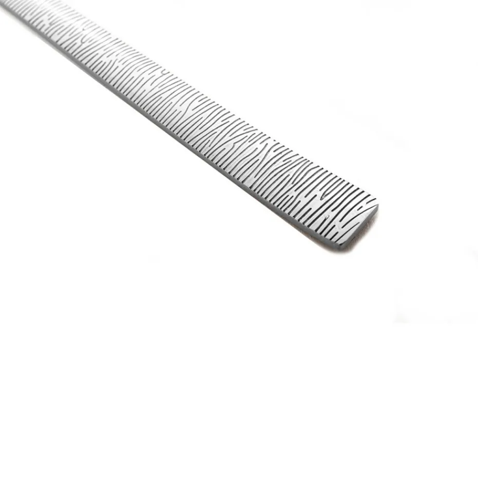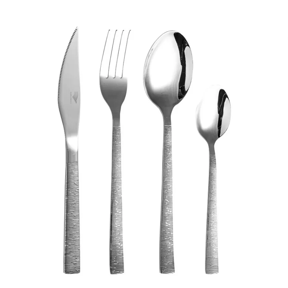 La ménagère « ANGOULÊME » est composée de couverts de forme élancée, au manche ciselé d’un décor zébré, sur lequel la lumière vient jouer pour habiller votre table avec originalité et raffinement.