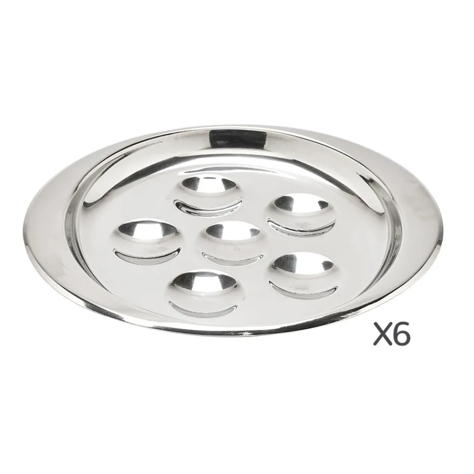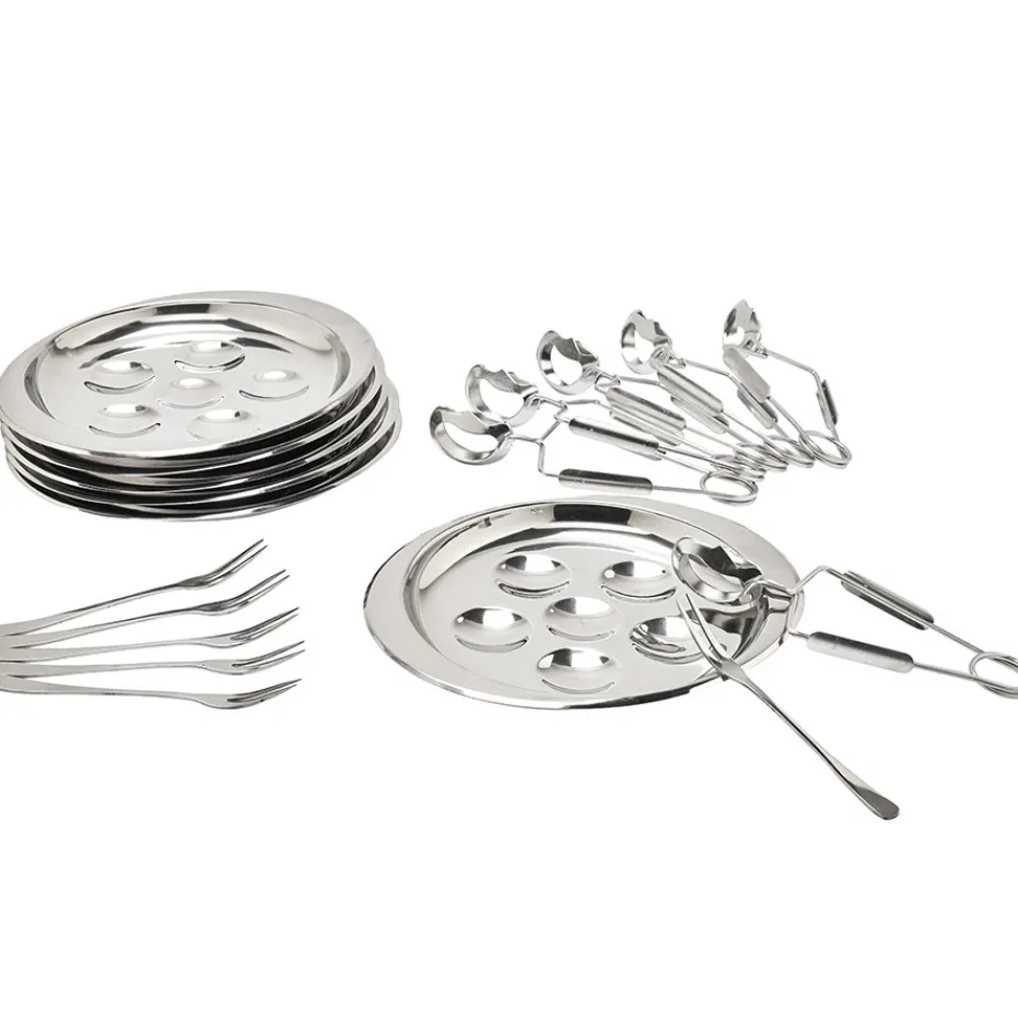 Composé de 6 assiettes avec 6 empreintes pour venir y déposer vos escargots, 6 pinces et 6 fourchettes à escargots.