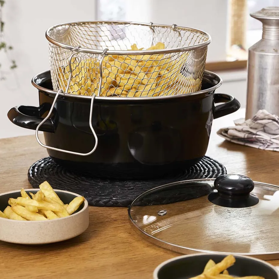 Conçue en acier émaillé, cette friteuse est dotée d’un panier en acier inoxydable et d’un couvercle en verre avec poignée.