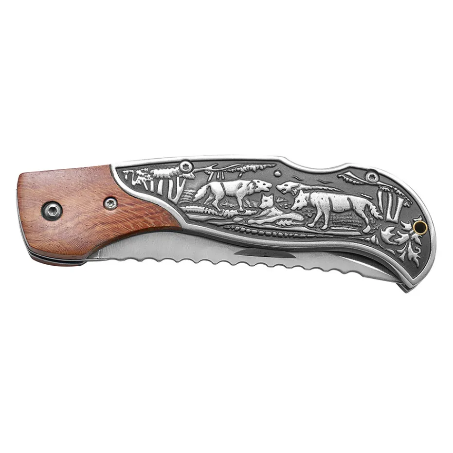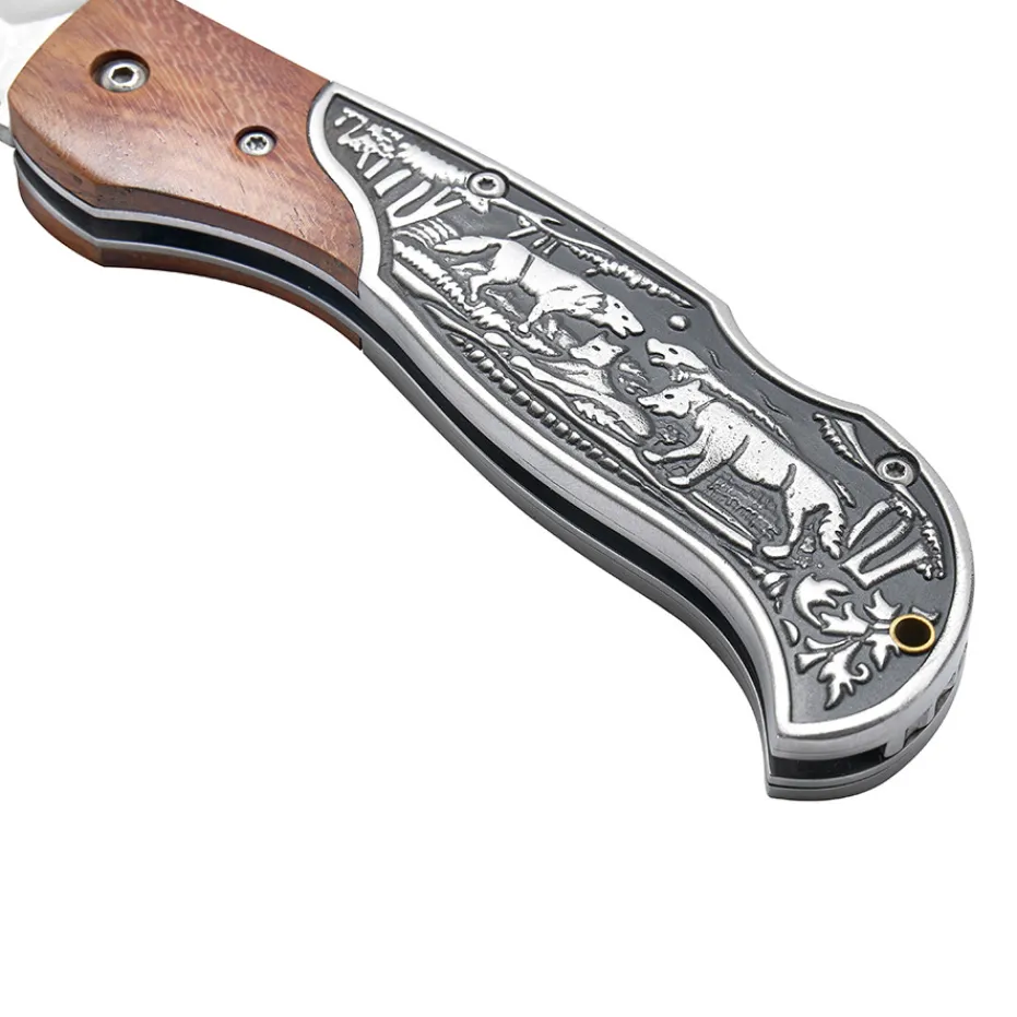 Son manche en bois de rose est accompagné de motif animal en acier inoxydable.